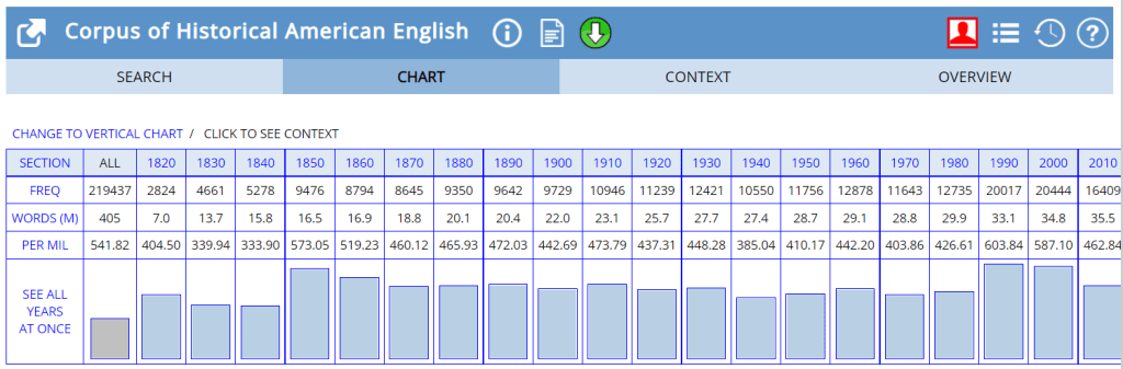 If you’re working from the corpus those dates and bar graphs can be clicked on to show more detailed data and specific usage. I did that. Why wouldn’t I? It’s not like I have a dozen+ chapters to edit…